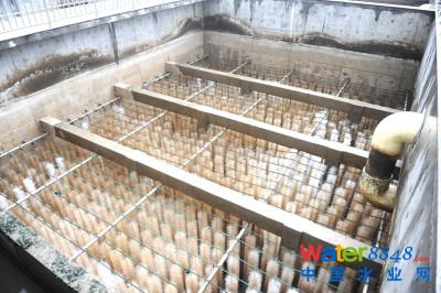 記者看到,在深8米的池中,一根根粘滿絨毛似的生物填料,豎立在池中,數(shù)量達(dá)到上百根。據(jù)介紹,整個(gè)生物接觸池分為兩組,一組分成四格,處理過后,進(jìn)入常規(guī)工藝的沉淀池。“水進(jìn)入沉淀池后,主要是讓水變清,濾去水中沉淀物,類似于過去在水中加礬的作用。”