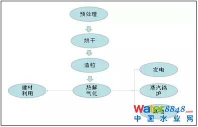 污泥熱解氣化技術是將污泥熱解氣化作為污泥處置的核心技術,以烘干、造粒、尾氣處置、廢渣利用為依托的系統(tǒng)工程。該技術工藝流程為:與處理后的污泥經(jīng)過低溫烘干,去除污泥表面的附著水及內(nèi)含水。烘干后的污泥在熱解氣化之前完成造粒,制成棒狀或片狀的均勻顆粒,烘干廢氣進入氣化系統(tǒng),造粒后的污泥進行熱解氣化,污泥中的有機物被氣化成可燃氣體,無機物以殘渣的形式排出?扇細怏w燃燒處理,可以利用能量,同時將有害物質轉換為煙氣,干凈的熱解氣供應給發(fā)動機或者燃氣輪機;熱解出的固體殘渣性能穩(wěn)定,可耐強酸腐蝕,而重金屬被固化在內(nèi)較難析出,由于其容易濕潤,所以出渣裝置需配備防堵塞措施。