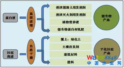 污泥經(jīng)水解處理后,其含蛋白液體經(jīng)濃縮后可作為蛋白發(fā)泡劑和有機肥等利用,污泥殘渣可用做覆土、綠化土、土壤改良劑和建筑材料等。