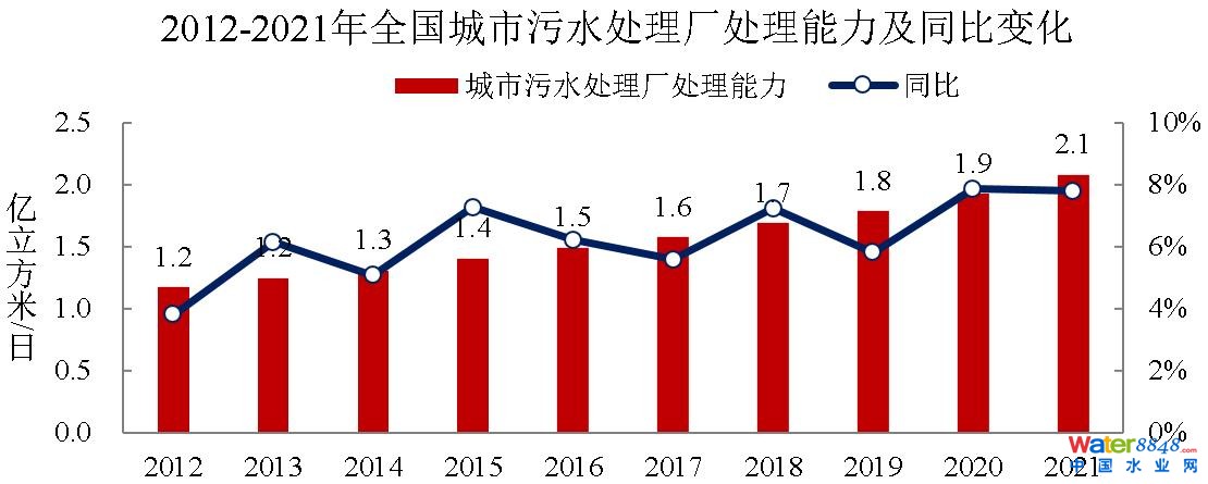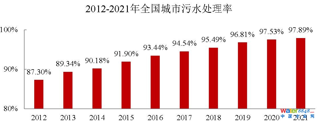 2021年年末,全國城市排水管道總長度87.2萬公里,同比增長8.7%;污水處理廠處理能力2.1億立方米/日,同比增長7.8%2021年,污水處理率97.89%,比上年增加0.36個百分點;城市生活污水集中收集率68.6%,比上年增加3.8個百分點。
