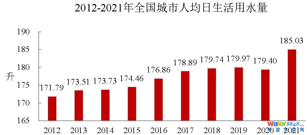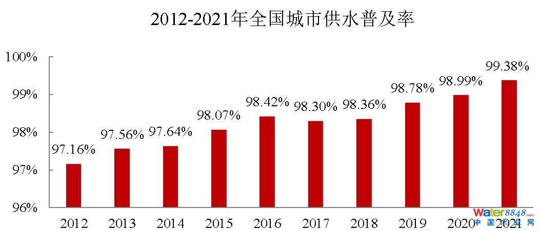 2021年,全國城市供水總量673.34億立方米,同比增長6.96%;城市供水管道長度105.99萬公里,同比增長5.26%;人均日生活用水量185.03升;供水普及率99.38%,比上年增加0.39個百分點。