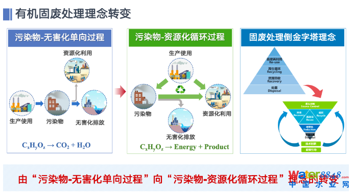 過去多年的環(huán)境治理核心是污染控制,有機(jī)固廢處置以無(wú)害化為目標(biāo)。現(xiàn)在面臨生態(tài)環(huán)境健康發(fā)展、降碳減污、綠色發(fā)展的發(fā)展趨勢(shì),未來有機(jī)固廢處置技術(shù)不能只關(guān)注無(wú)害化,而是以無(wú)害化為目標(biāo),充分考慮資源化的手段,實(shí)現(xiàn)污染物-資源化循環(huán)過程。