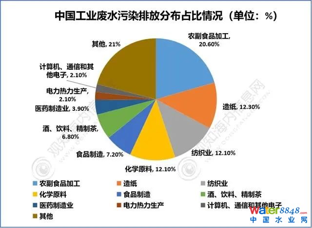 從我國(guó)工業(yè)廢水污染物排放分布情況來(lái)看,農(nóng)副食品加工業(yè)占20.60%,工業(yè)廢水污染物排放量排第一位;第二是造紙及紙制品業(yè),占12.30%;第三是紡織業(yè)、化學(xué)原料和化學(xué)制品制造業(yè),各占12.10%。
